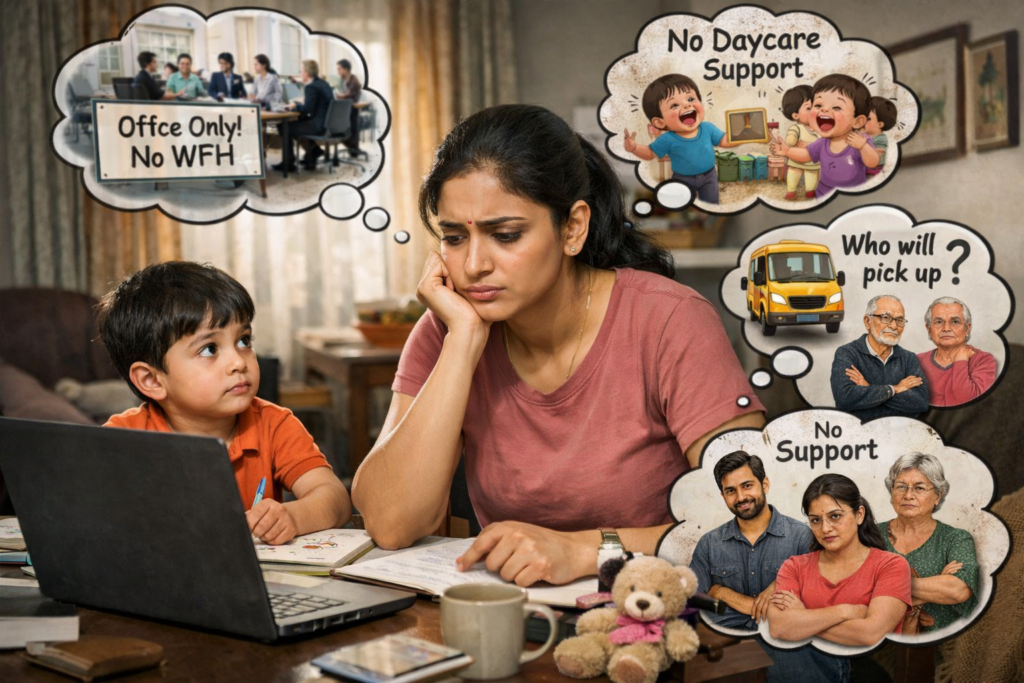 ,I want one image in this image one women she has 5-year-old kids searching for a job, working from home, a small compay’s is hiring only work from office candidate and they do not want to give work and response why we will send our kids to daycare, they do not want to give daycare fees. I don’t know how to manage like that woman and society
